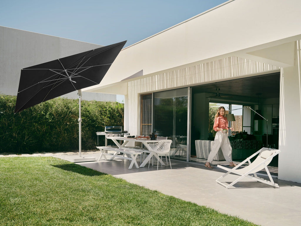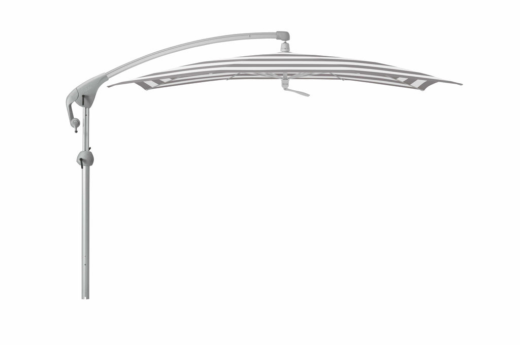Deze Zweefparasol is voorzien van kogelgelagerde bodemplaat waarmee de parasol om zijn as kan draaien.