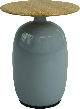 Het onderstel is gemaakt van geglazuurd keramiek en verkrijgbaar in de kleuren Coffee, Emerald, Smoke en Clay.. Het ronde tafelblad is vervaardigd uit fijn geplijst teakhout.