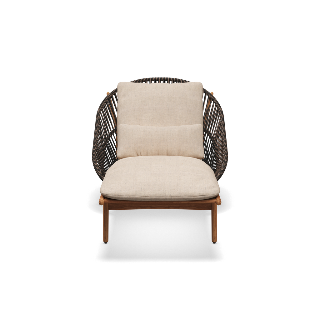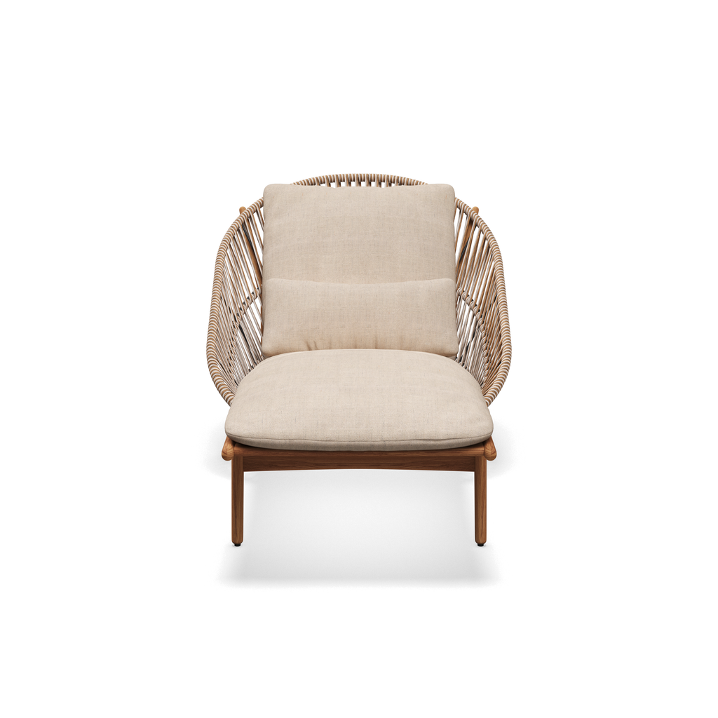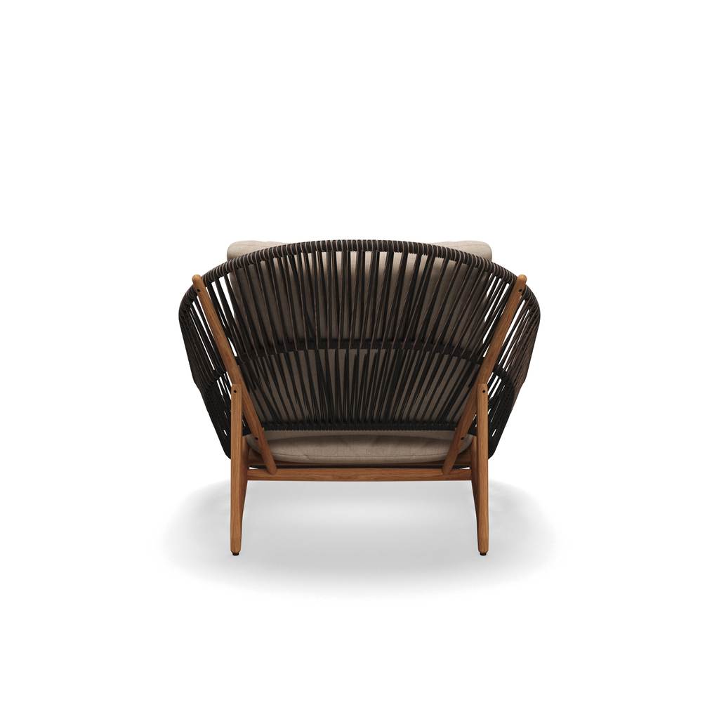 Om het geronde frame van a-klasse teak is een kunststof draad omwikkeld.