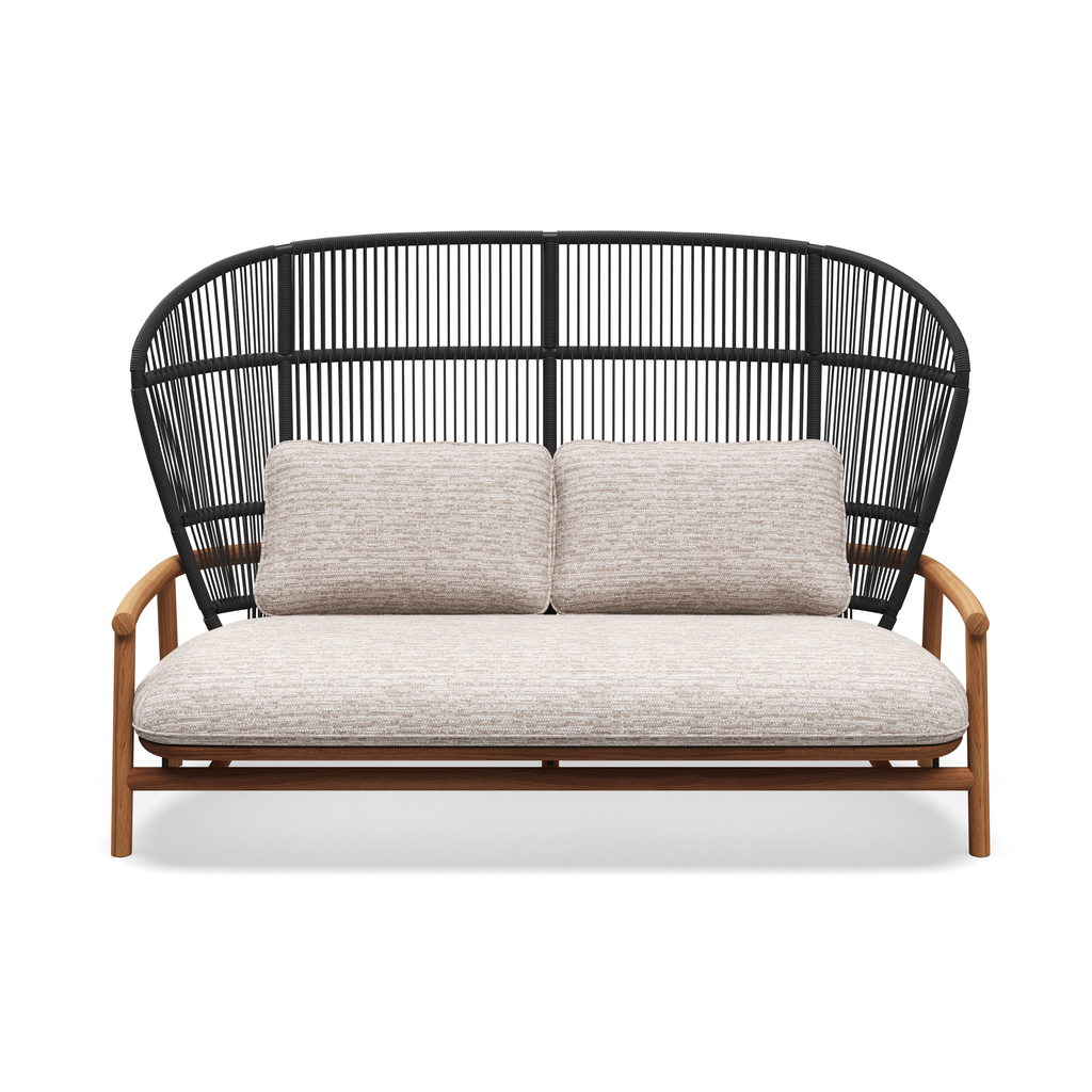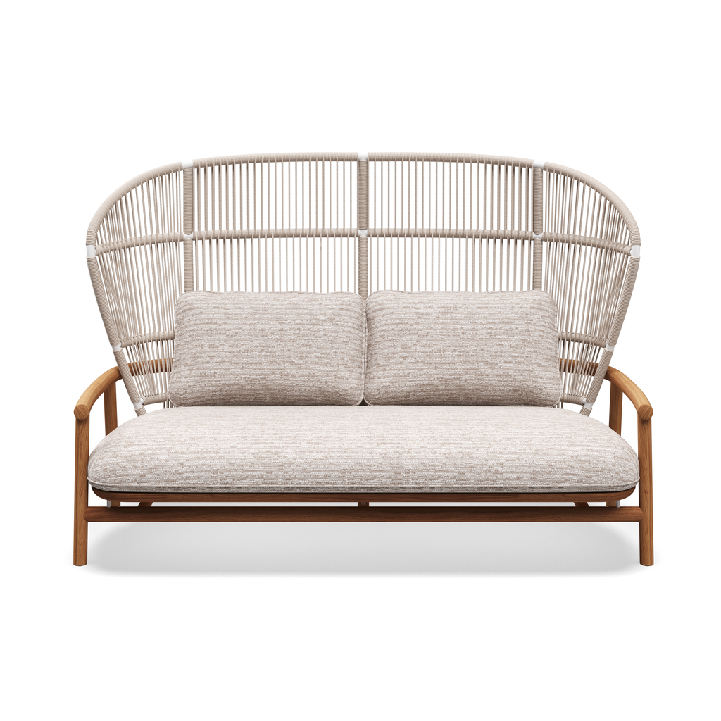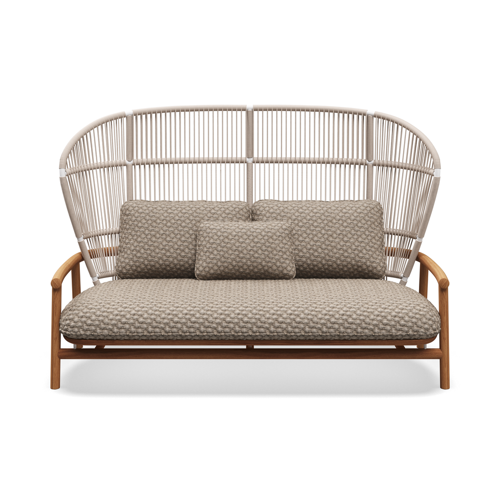 Frame is van teakhout en de hoge rugleuning is gemaakt van gepoedercoat aluminium in de kleur meteor of wit. Met wit frame krijgt u Dune kleur rope en met meteor frame de kleur Raven rope.