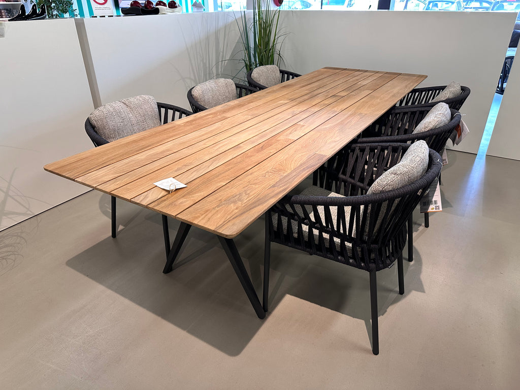 1x Split dining table 280x92cm met meteor frame en teak blad á € 4.950