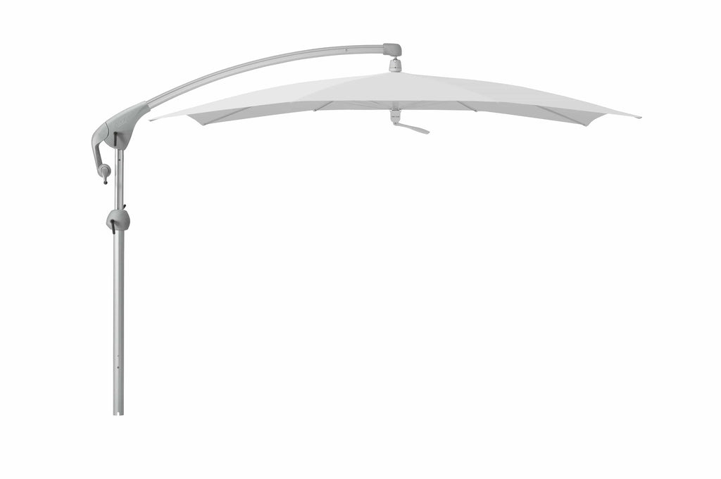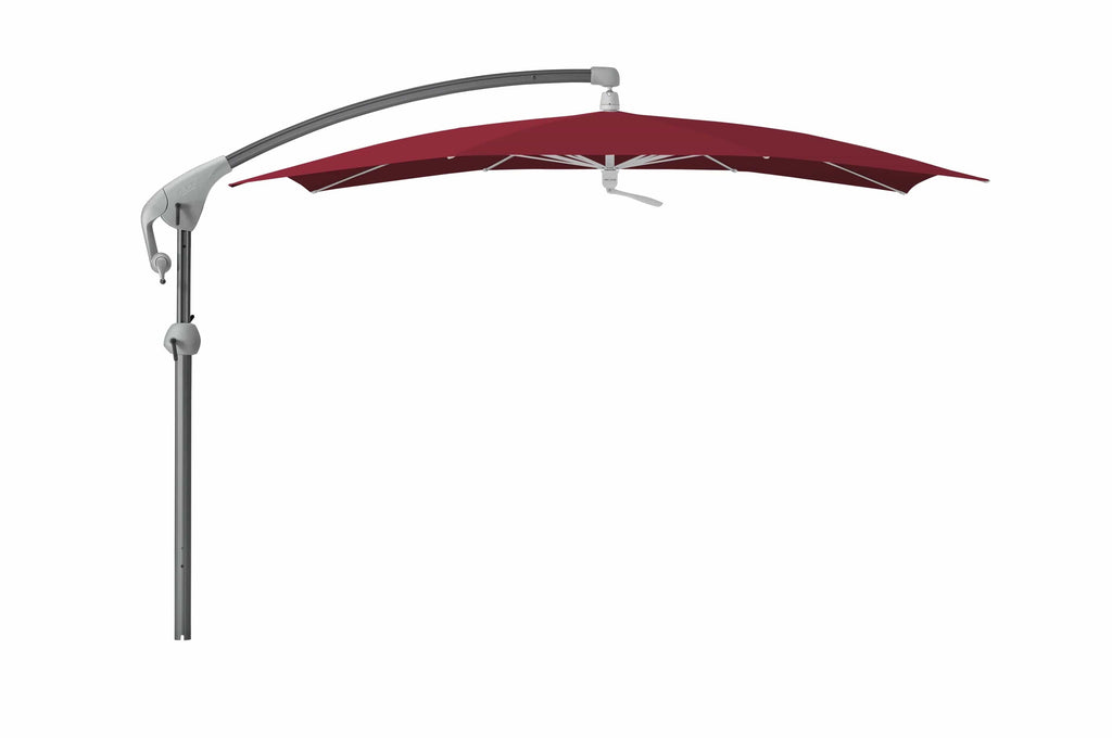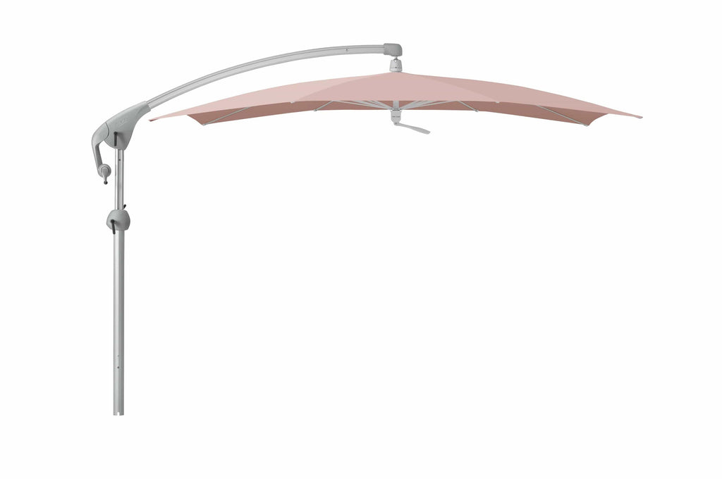 Deze Zweefparasol is voorzien van kogelgelagerde bodemplaat waarmee de parasol om zijn as kan draaien.
