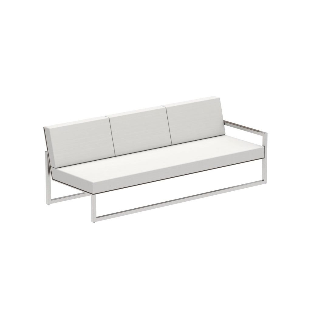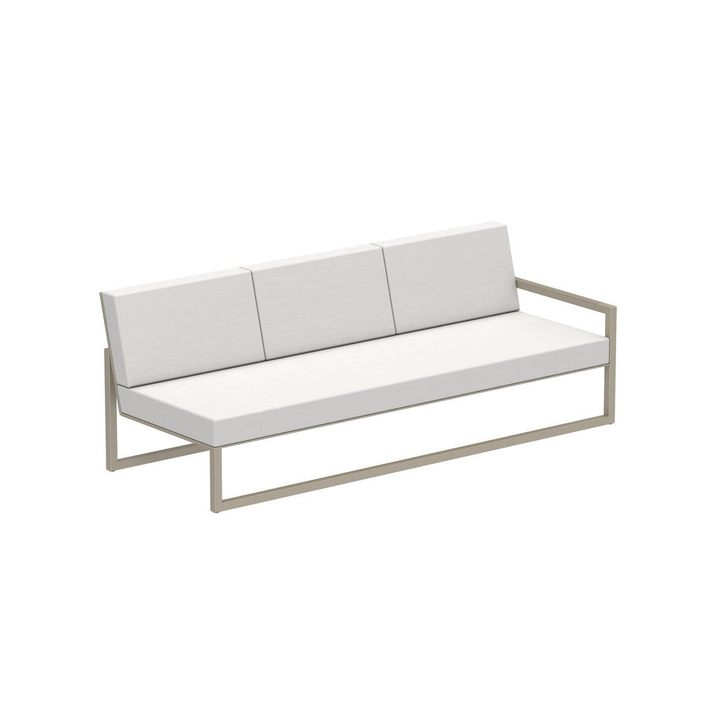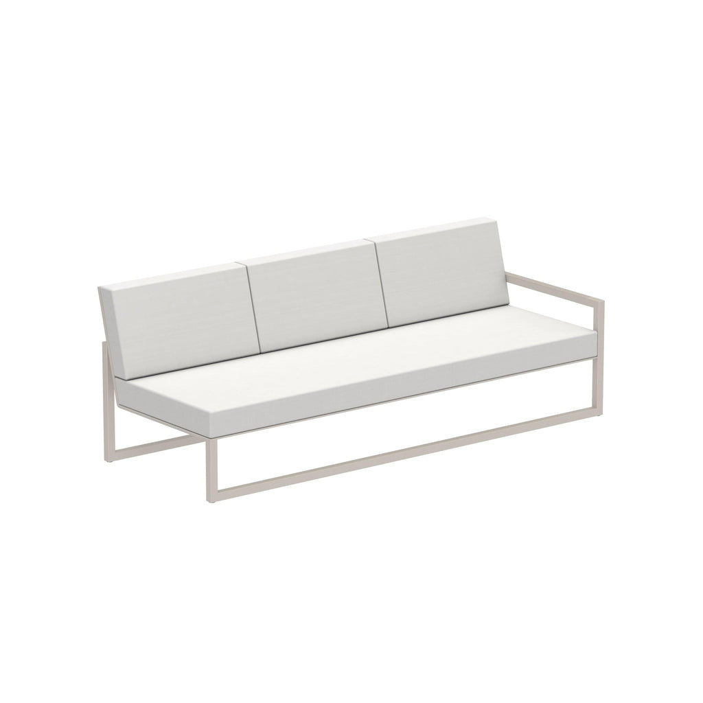 Royal Botania Ninix modulaire driezitsbank. Het frame kan uitgevoerd worden in geborsteld RVS, Electro polisched RVS of gepoedercoat aluminium met keuze uit de kleuren wit, pebble, sand, antraciet en brons. Deze module is voorzien van een Batyline® zitting en rug en mogelijk in de kleuren wit, cappucino, pearl grey, zwart en graphite.