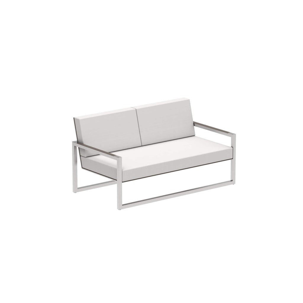 Royal Botania Ninix twee zitsbank. Het frame kan uitgevoerd worden in geborsteld RVS, Electro polished RVS of gepoedercoat aluminium met keuze uit de kleuren wit, pebble, sand, antraciet en brons. Deze module is voorzien van een Batyline® zitting en rug en mogelijk in de kleuren wit, cappucino, pearl grey, zwart en graphite.