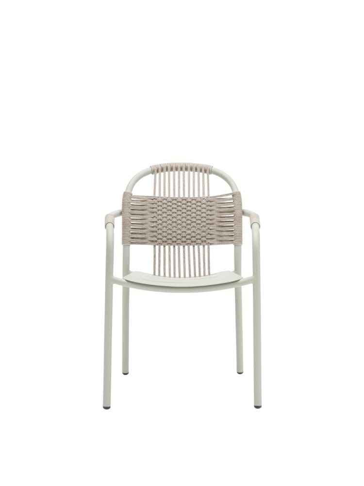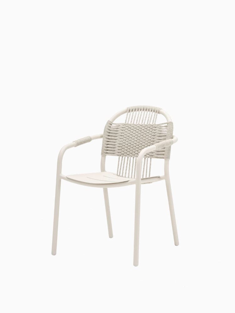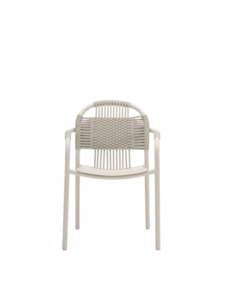 Het strakke ontwerp wordt aangevuld door geweven touwdetails in de kleuren Misty Dots of Dune White, die elegantie toevoegen aan elke tuinsetting.