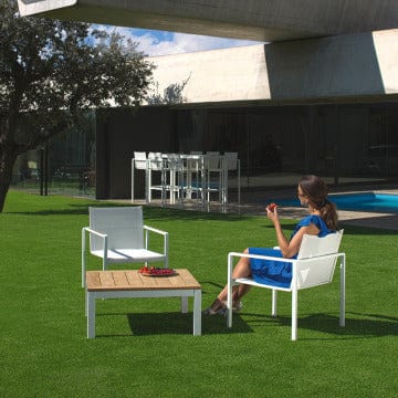 Royal Botania lage relax stoel met armleuningen van de Alura collectie, ontworpen door Kris van Puyvelde. Het frame is van gepoedercoat aluminium en verkrijgbaar in vier verschillende kleuren: Antraciet, Pebble, Brons en Wit. De zitting en rugleuning zijn gemaakt van het stevige en weerbestendige materiaal Batyline.