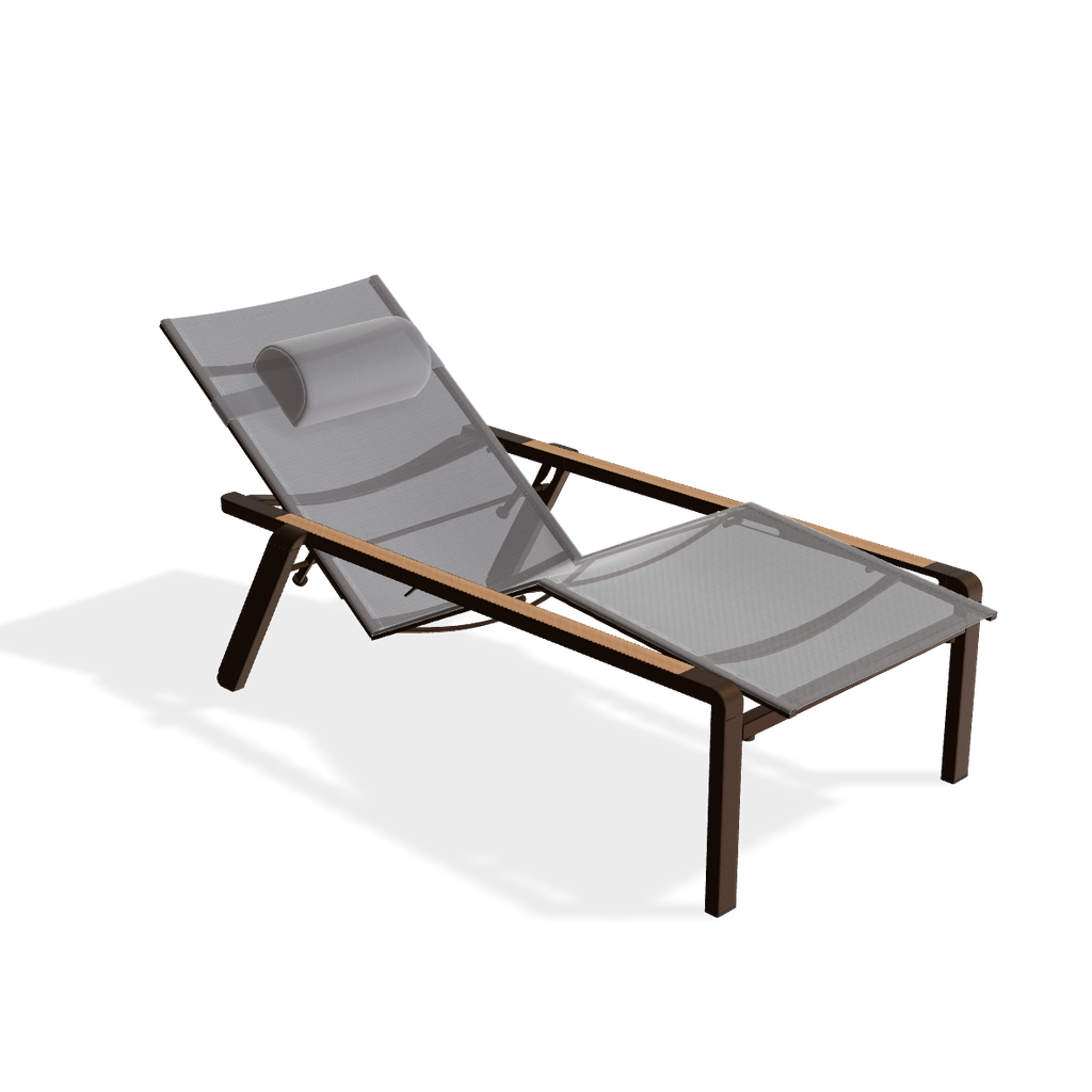 Het ligbed in de kleur Brons is standaard voorzien van teakhouten arminleg.