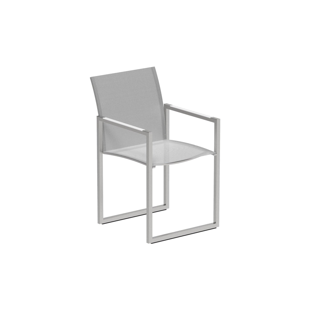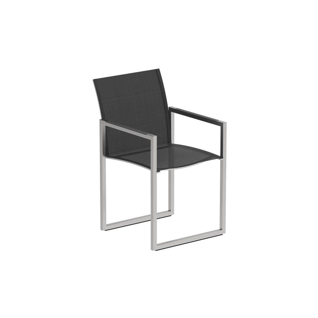 Royal Botania stoel van de Ninix collectie, ontworpen door Kris van Puyvelde. Het frame is van geborsteld RVS, Electro polished RVS of gepoedercoat RVS in de kleur antraciet, Pebble, sand, brons of wit. De zitting en rugleuning zijn gemaakt van het stevige en weerbestendige materiaal Batyline®.