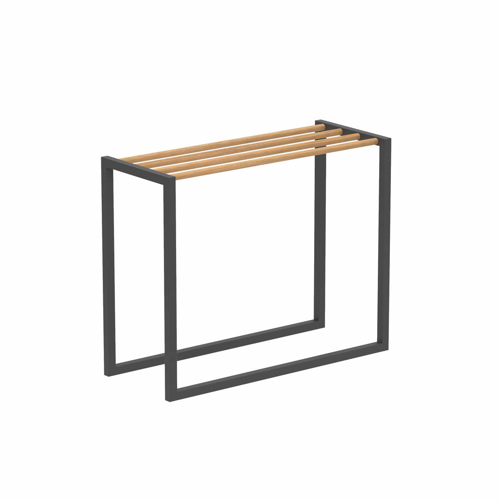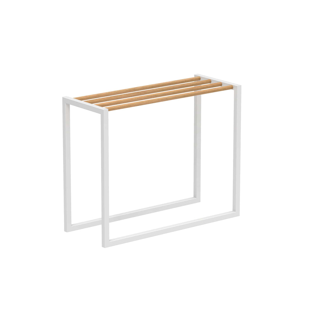 Royal Botania handdoekenrek van de Ninix collectie, ontworpen door Kris van Puyvelde. Het frame is van geborsteld RVS, Electro polished RVS of gepoedercoat RVS in de kleur wit, pebble, sand, bronze en antraciet.