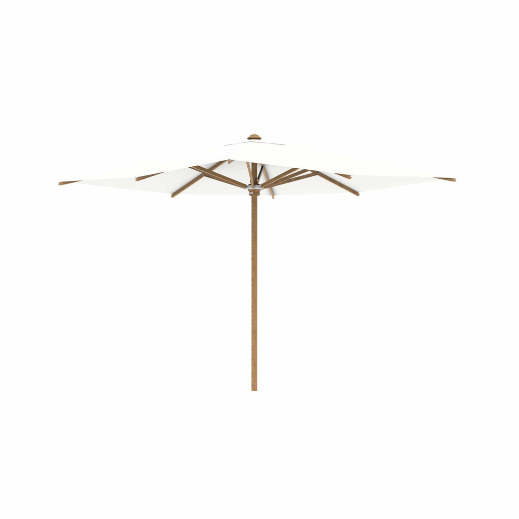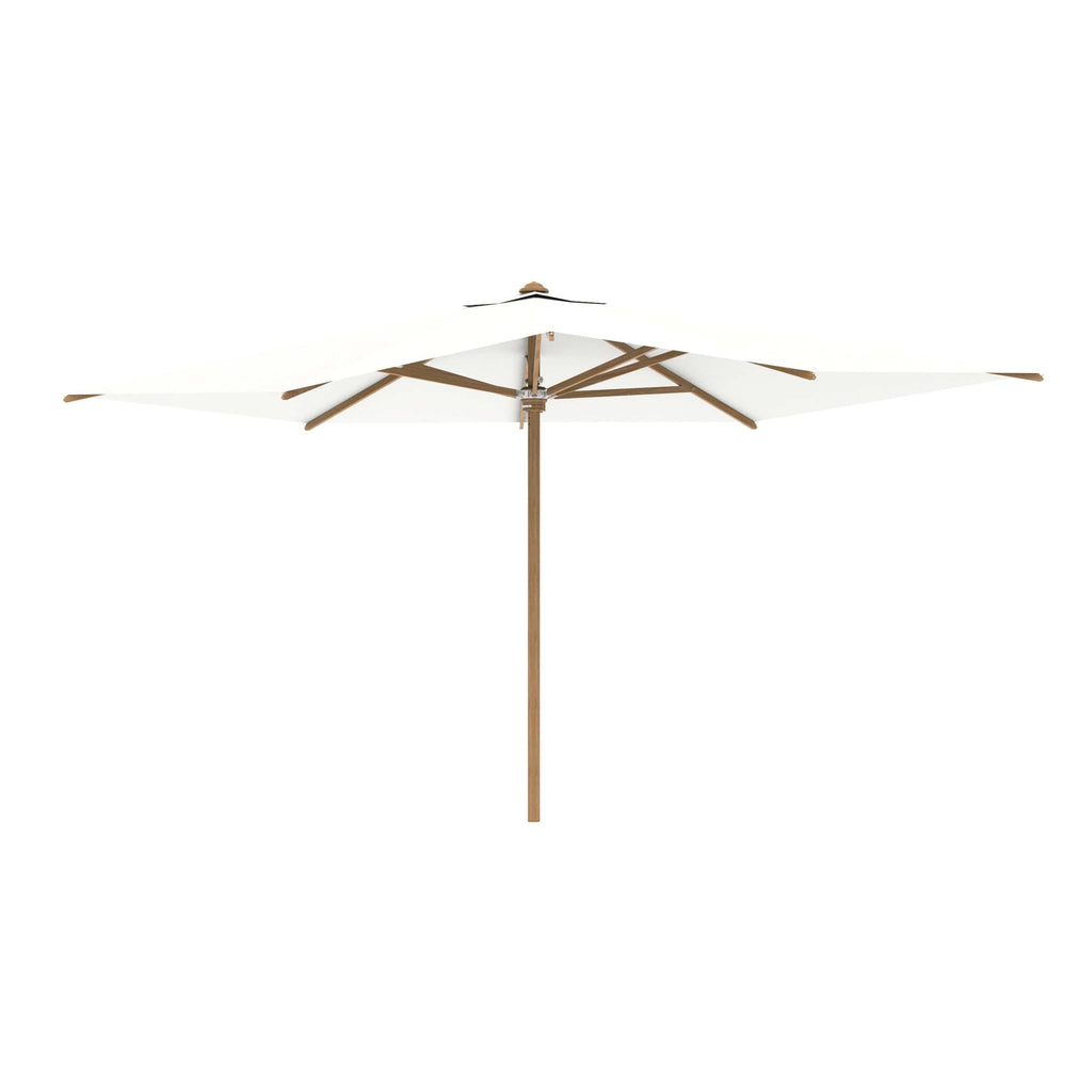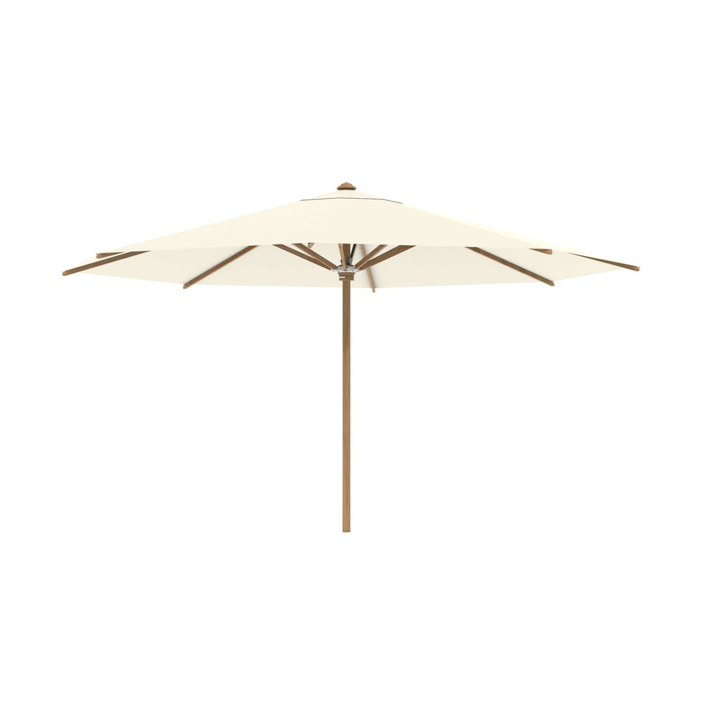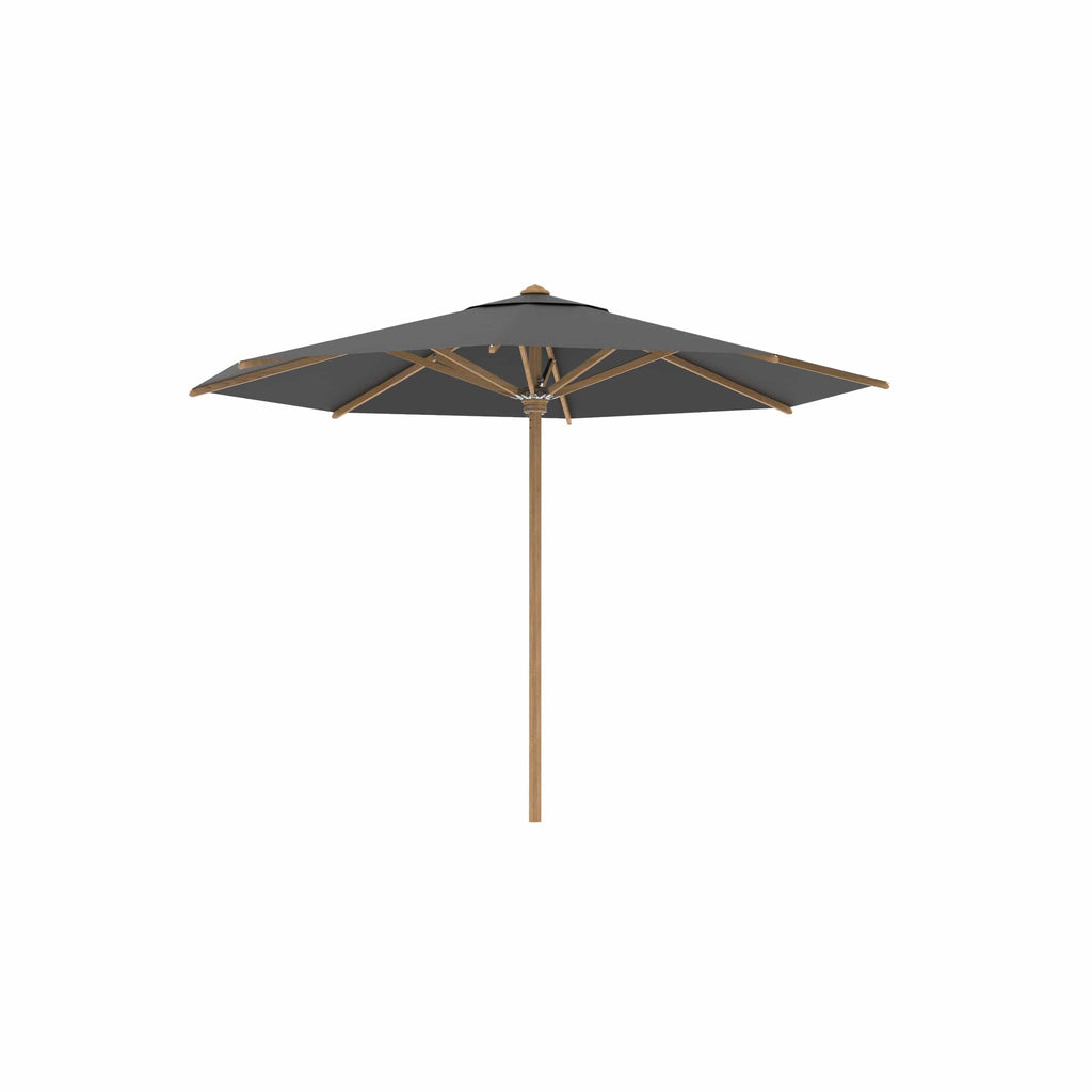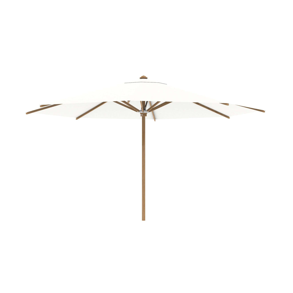 Royal Botania parasol van de Shady-collectie, ontworpen door Kris van Puyvelde. De parasolstok en de baleinen zijn gemaakt van teakhout. Het parasoldoek is gemaakt van het stevig en weerbestendig acryl en verkrijgbaar in diverse kleuren.