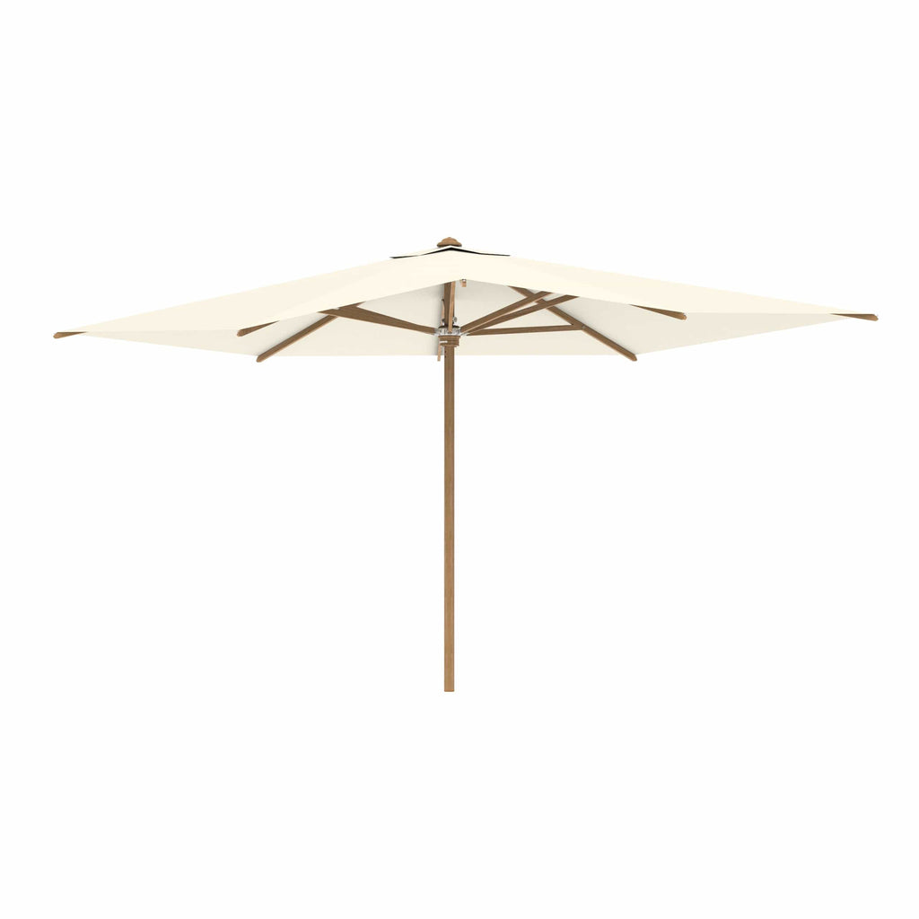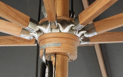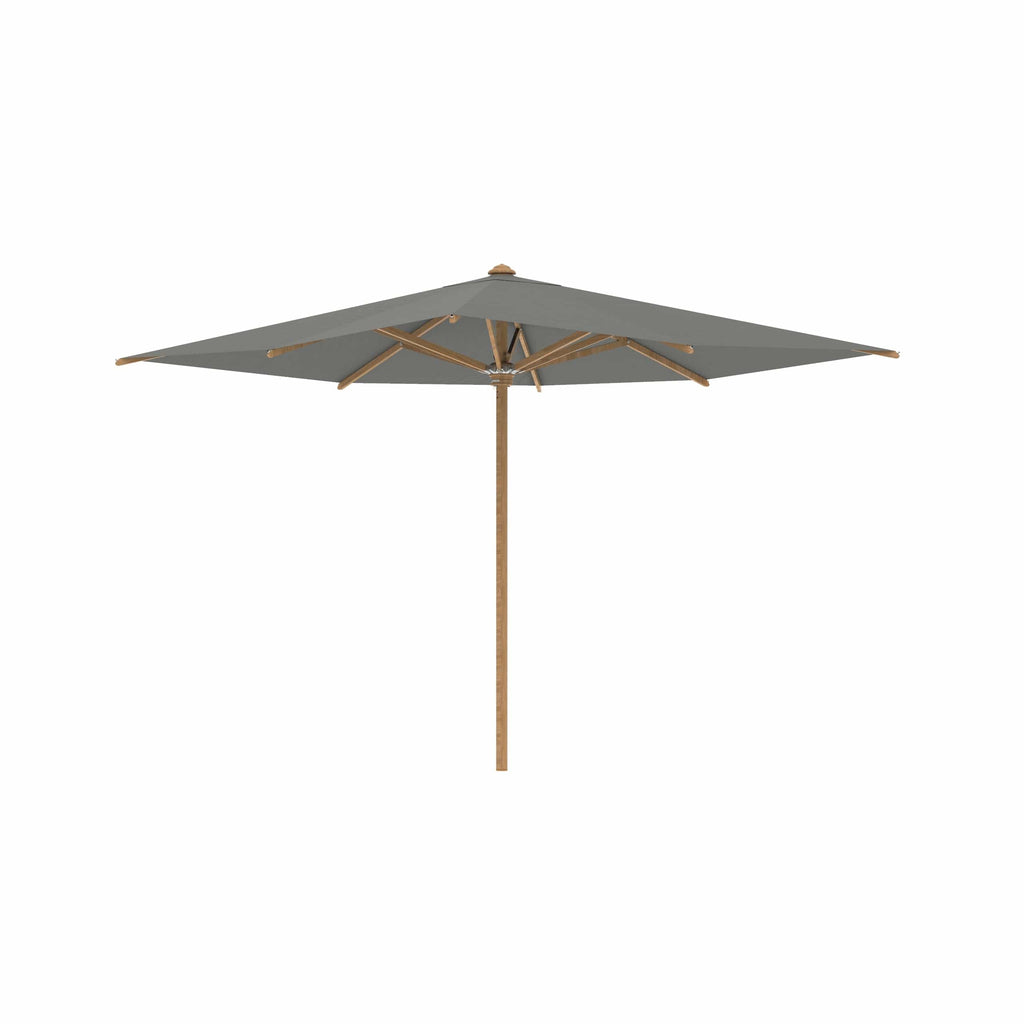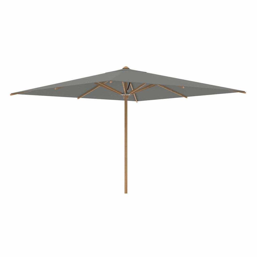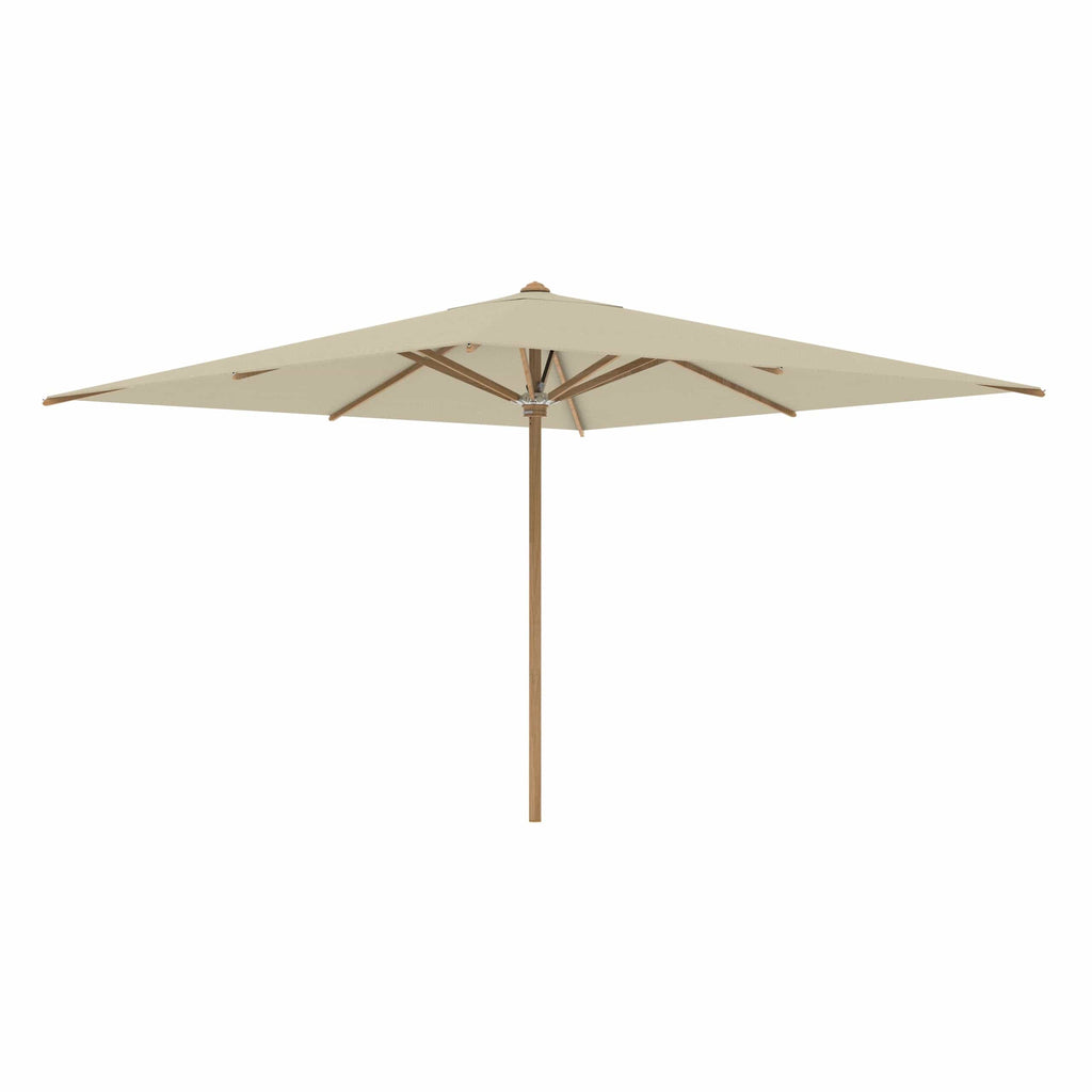 Royal Botania parasol van de Shady-collectie, ontworpen door Kris van Puyvelde. De parasolstok en de baleinen zijn gemaakt van teakhout. Het parasoldoek is gemaakt van het stevig en weerbestendig acryl en verkrijgbaar in diverse kleuren.