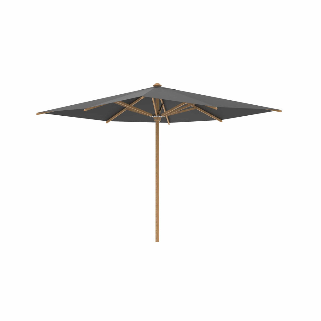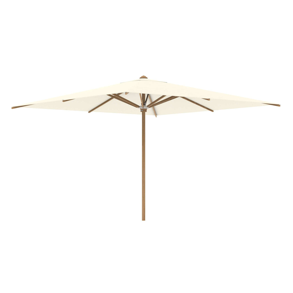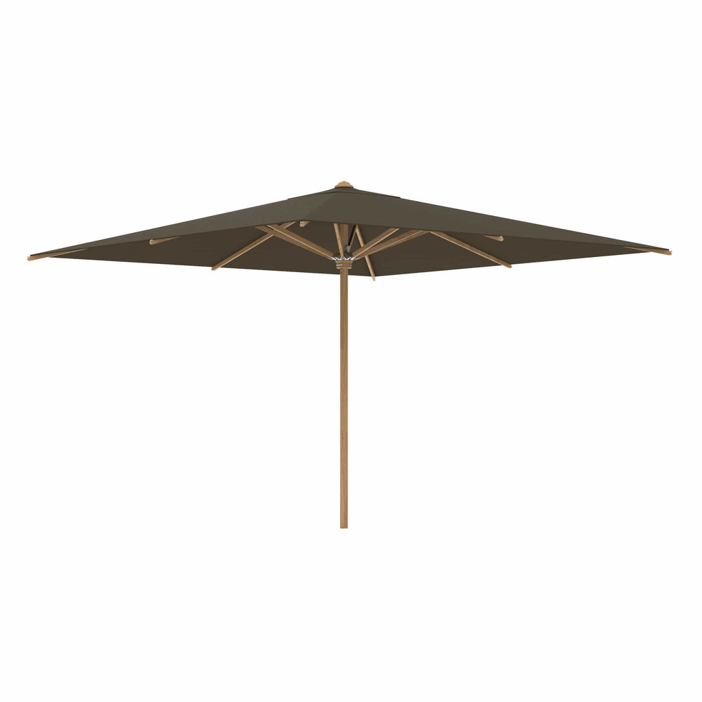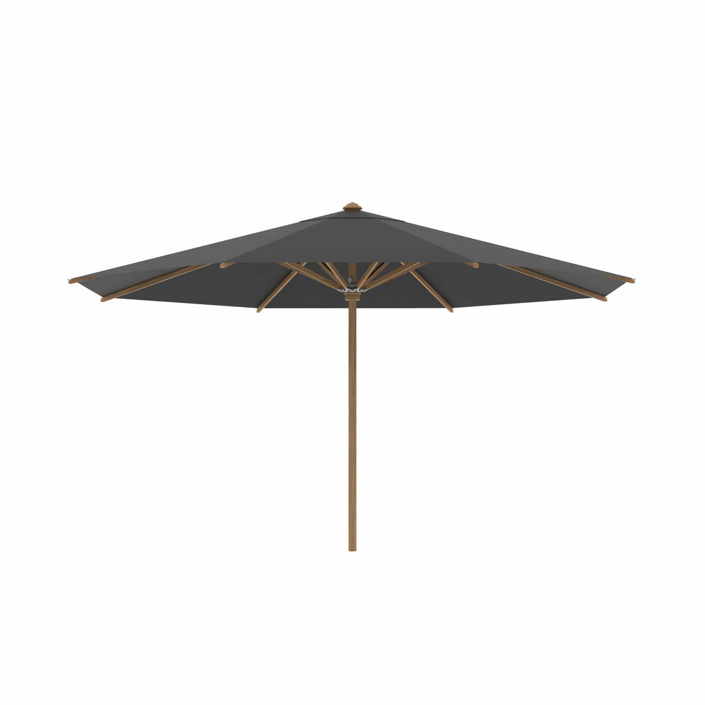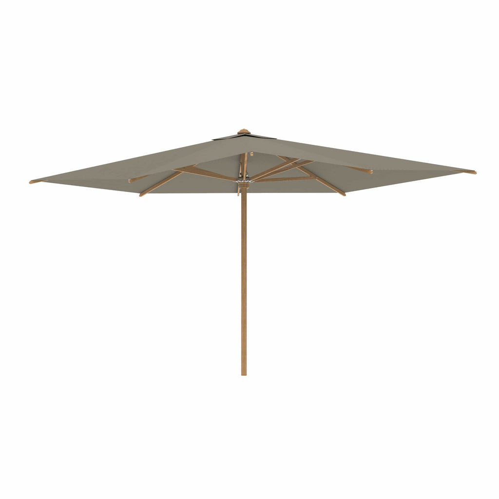 Royal Botania parasol van de Shady-collectie, ontworpen door Kris van Puyvelde. De parasolstok en de baleinen zijn gemaakt van teakhout. Het parasoldoek is gemaakt van het stevig en weerbestendig acryl en verkrijgbaar in diverse kleuren.