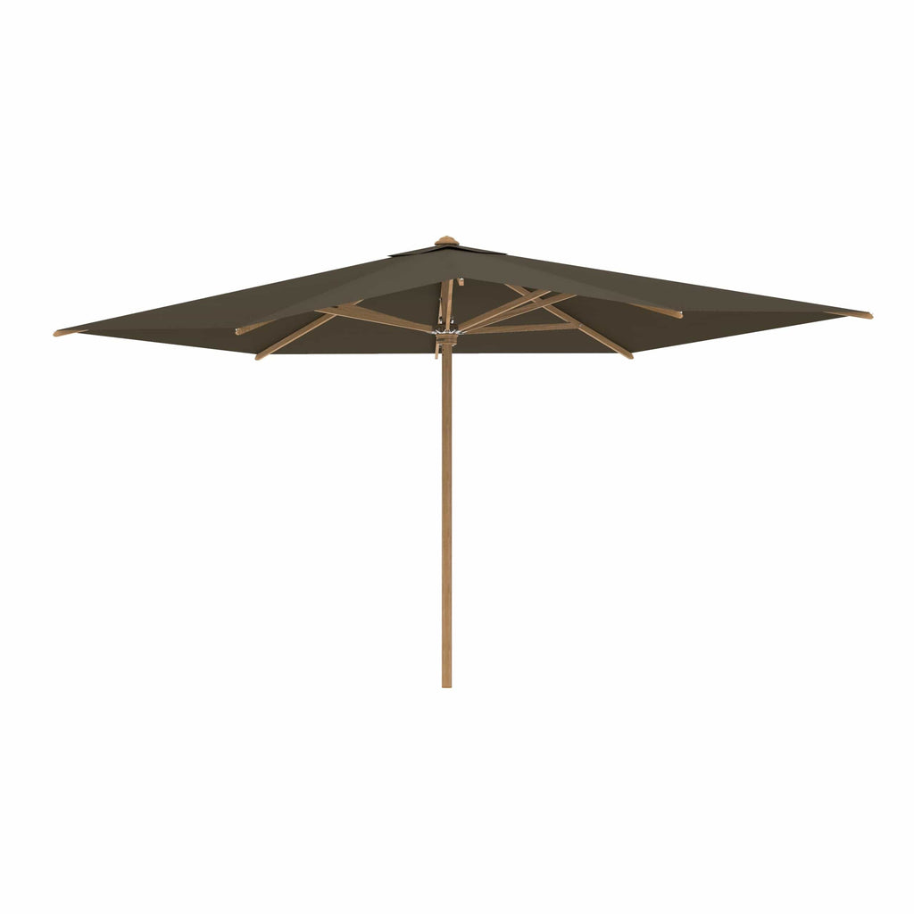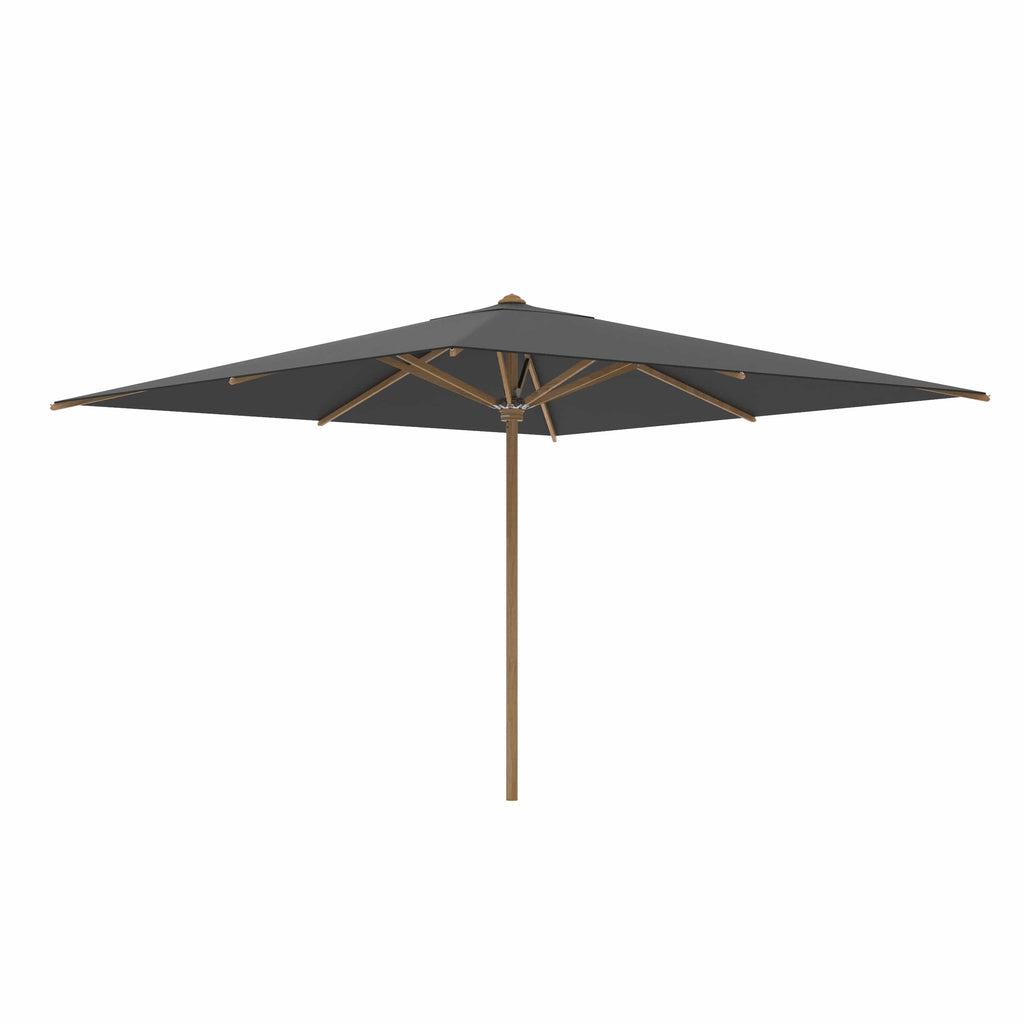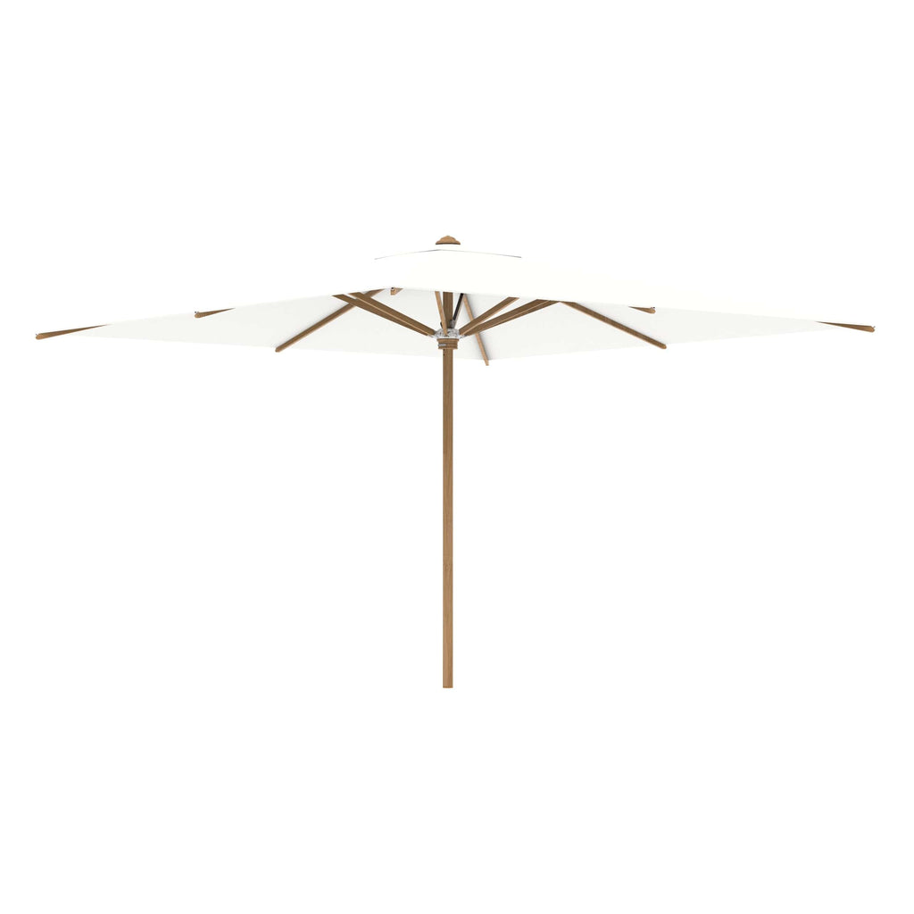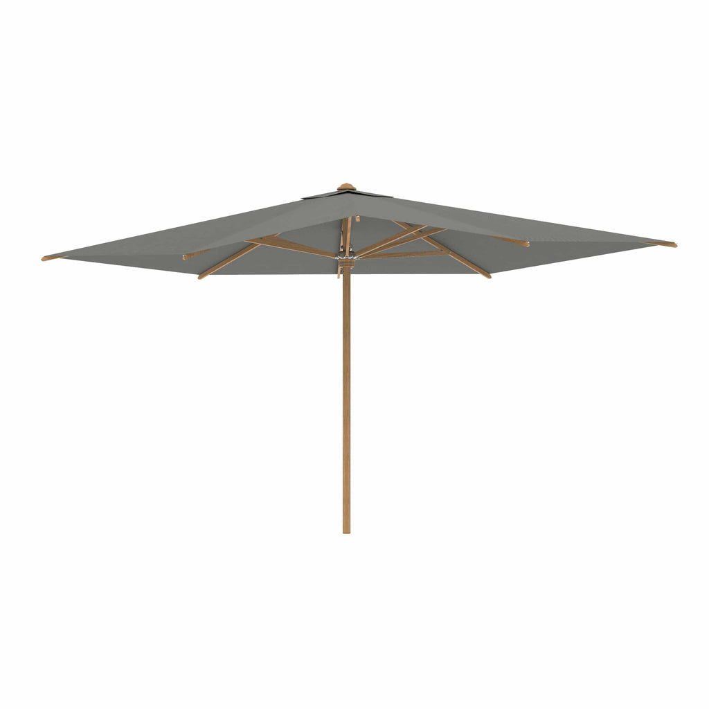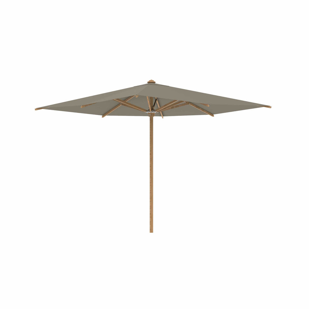 Royal Botania parasol van de Shady-collectie, ontworpen door Kris van Puyvelde. De parasolstok en de baleinen zijn gemaakt van teakhout. Het parasoldoek is gemaakt van het stevig en weerbestendig acryl en verkrijgbaar in diverse kleuren.