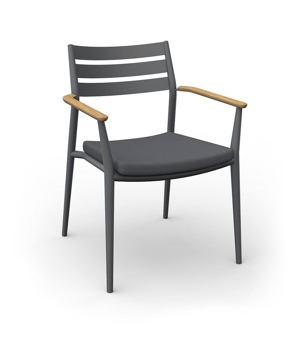 De Pia stoel is volledig van aluminium en is verkrijgbaar in de kleuren antraciet, petrol of wit. De Pia stoel is voorzien van teakhouten armleggers
