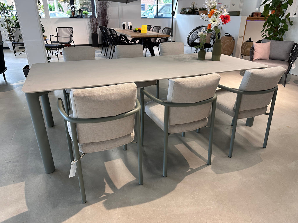 1x Kori dining table 240x100cm met cement green gepoedercoat rvs frame en oyster stone keramisch blad á € 4.490