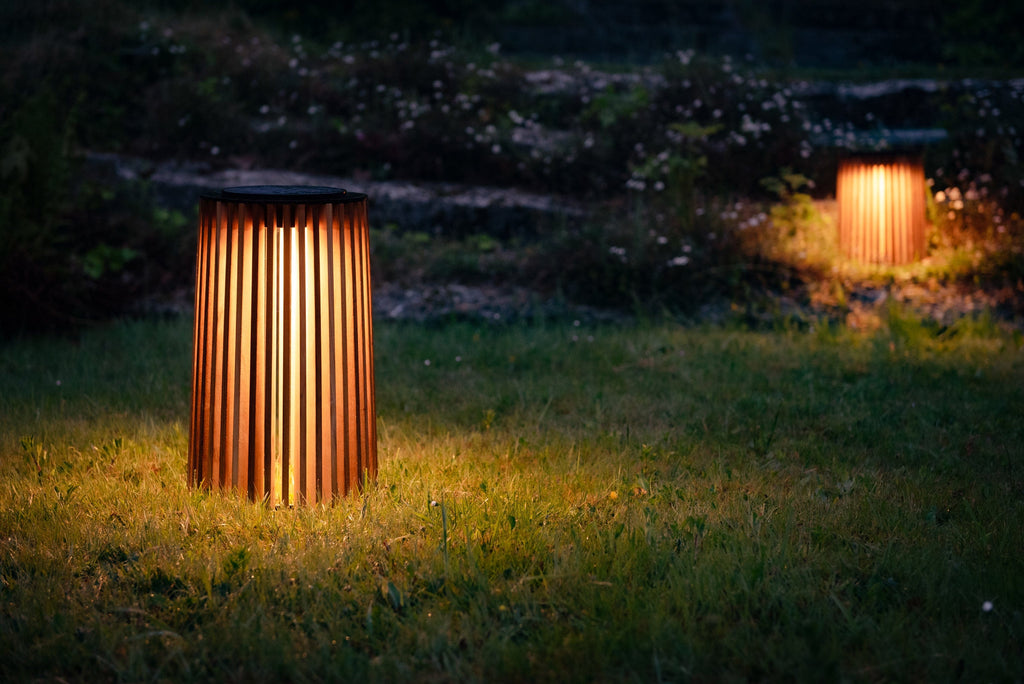 De Maya lampen van Vincent Sheppard zijn voorzien van een solar LED - module maar zijn ook oplaadbaar via een stekker. Het armatuur is gemaakt van een zwart frame met teakhouten raster